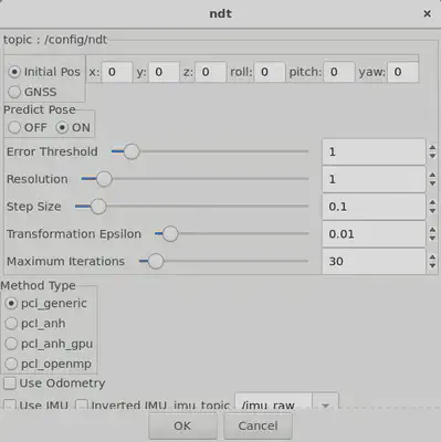 For [Method Type], choose the [pcl_generic] if the autoware.ai was compiled without CUDA enabled. There is no doubt that [pcl_anh_gpu] has advantages in speed when processing the point clouds data. However, as mentioned in previous section, even though we managed to compile the autoware.ai with CUDA enabled, when choosing [ndt_anh_gpu], ndt_mapping module was always stuck somewhere during the processing of the point clouds data. At the last, we decided to simply use the [pcl_generic] to process the data by CPU.