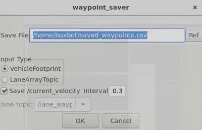 Starting moving the vehcile along the desired path. When vehicle arrives the destination, uncheck the box in front of the ‘waypoint_saver’. All waypoints will be saved as a CSV file in pre-defined path. Here is the waypoints we recored for the boxbot demo.