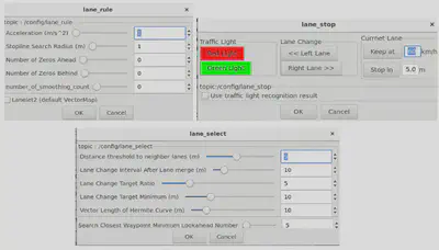 These three modules are related to the behavior controlling of the vehicle for traffic lights and lane changing. These are not the concerns for boxbot at the moment, but still need to be initiated for lane planning. Therefore, all parameters of them can be kept as default.