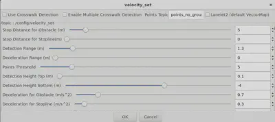 please note that ‘velocity_set’ module requires the point clouds topic ‘/point_no_ground’ as input, which is the reason that ‘ring_ground_filter’ and ‘ring_filter’ modules were needed.