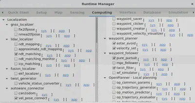 As the face discussed in Section 2.3, the transformation between frame ‘map’ to ‘base_link’ was computed by Autoware ndt_matching module. In [ndt_matching] under [Computing] tag, click the [app] to adjust the parameters.