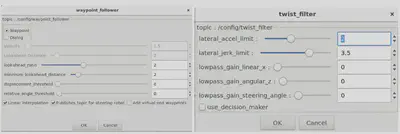 These two modules were used to let the vehicle follows the pre-recorded waypoints, and publish the topic ‘/twist_cmd’ which contains the linear and angular velocities that will be listened by vehicle’s CAN system. The configurations of these two moduels are like this: