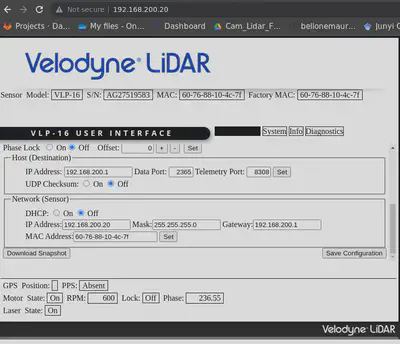 LiDAR sensor is compulsory for the deployment of Autoware, because its essential mapping and localization modules are based on the point cloud data. There is no specific requirement about the model of LiDAR sensor. Theoretically any LiDAR sensor which can be initiated in ROS and publish point cloud data as a topic can be used for the vehicles. The LiDAR sensor we used in boxbot is the Velodyne VLP-16, which has the active support of the drivers from the ROS community. Most of the configurations of the Velodyne VLP-16 driver can be kept as default, except the IP address and port of the LiDAR. Refer to the manual book of the Velodyne VLP-16, the IP address and port can be modified through the web interface of the sensor. It is first need to know the current IP address of the LiDAR sensor, also make sure sensor and host are connected by the ethernet cable. Open a web browser and put the sensor’s IP address in it, an interface like this will be shown in browser.