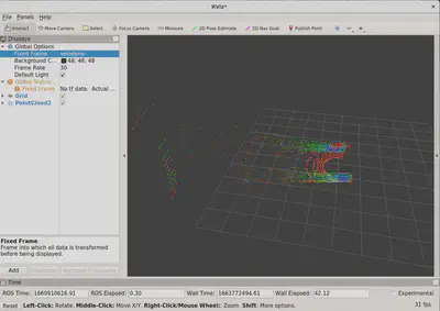 Point clouds can be verified and visualized in Rviz, which can be initiated in runtime manager. Add the corresponding topic and change the [Fixed Frame] to ‘velodyne’ (the frame_id of point clouds topic). Here is an example of the point cloud visualization.