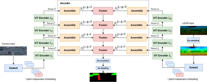Critical research about camera-and-LiDAR-based semantic object segmentation for autonomous driving significantly benefited from the recent development of deep learning. Specifically, the vision transformer is the novel ground-breaker that successfully brought the multi-head-attention mechanism to computer vision applications. Therefore, we propose a vision-transformer-based network to carry out camera-LiDAR fusion for semantic segmentation applied to autonomous driving. Our proposal uses the novel progressive-assemble strategy of vision transformers on a double-direction network and then integrates the results in a cross-fusion strategy over the transformer decoder layers. Unlike other works in the literature, our camera-LiDAR fusion transformers have been evaluated in challenging conditions like rain and low illumination, showing robust performance. The paper reports the segmentation results over the vehicle and human classes in different modalities: camera-only, LiDAR-only, and camera-LiDAR fusion. We perform coherent controlled benchmark experiments of CLFT against other networks that are also designed for semantic segmentation. The experiments aim to evaluate the performance of CLFT independently from two perspectives: multimodal sensor fusion and backbone architectures. The quantitative assessments show our CLFT networks yield an improvement of up to 10% for challenging dark-wet conditions when comparing with Fully-Convolutional-Neural-Network-based (FCN) camera-LiDAR fusion neural network. Contrasting to the network with transformer backbone but using single modality input, the all-around improvement is 5-10%.